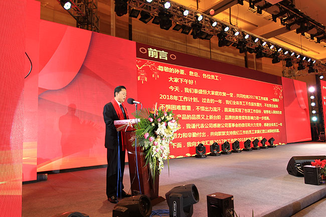 之后總經理黃佑忠作了全面細致的工作報告,總結了公司2017年的工作成績及亮點,安排部署了2018年的各項工作任務。黃總在報告中指出,2018年公司總體發展將圍繞“一個中心、兩大任務、三項指標、四大提升、五個項目”展開,大家在新的一年里齊心協力,在“一二三四五”發展思路的指引下,以更加飽滿的工作激情,奮力譜寫公司事業發展新篇章。