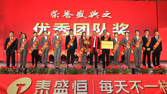 會上,對2017年取得突出成績的優秀團隊及個人,以及在公司工作五年以上的老員工進行了隆重表彰,公司高層領導分別上臺宣布了獲獎名單并為其頒獎。其中,泰盛廣場項目獲得優秀項目獎、營銷管理中心和招采管理中心獲得優秀團隊獎,孫董為獲獎團隊頒獎了榮譽獎牌。成績只代表過去,希望獲獎的團隊及個人在新的一年里戒驕戒躁、再接再厲,充分發揮模范帶頭作用,為公司發展再立新功。