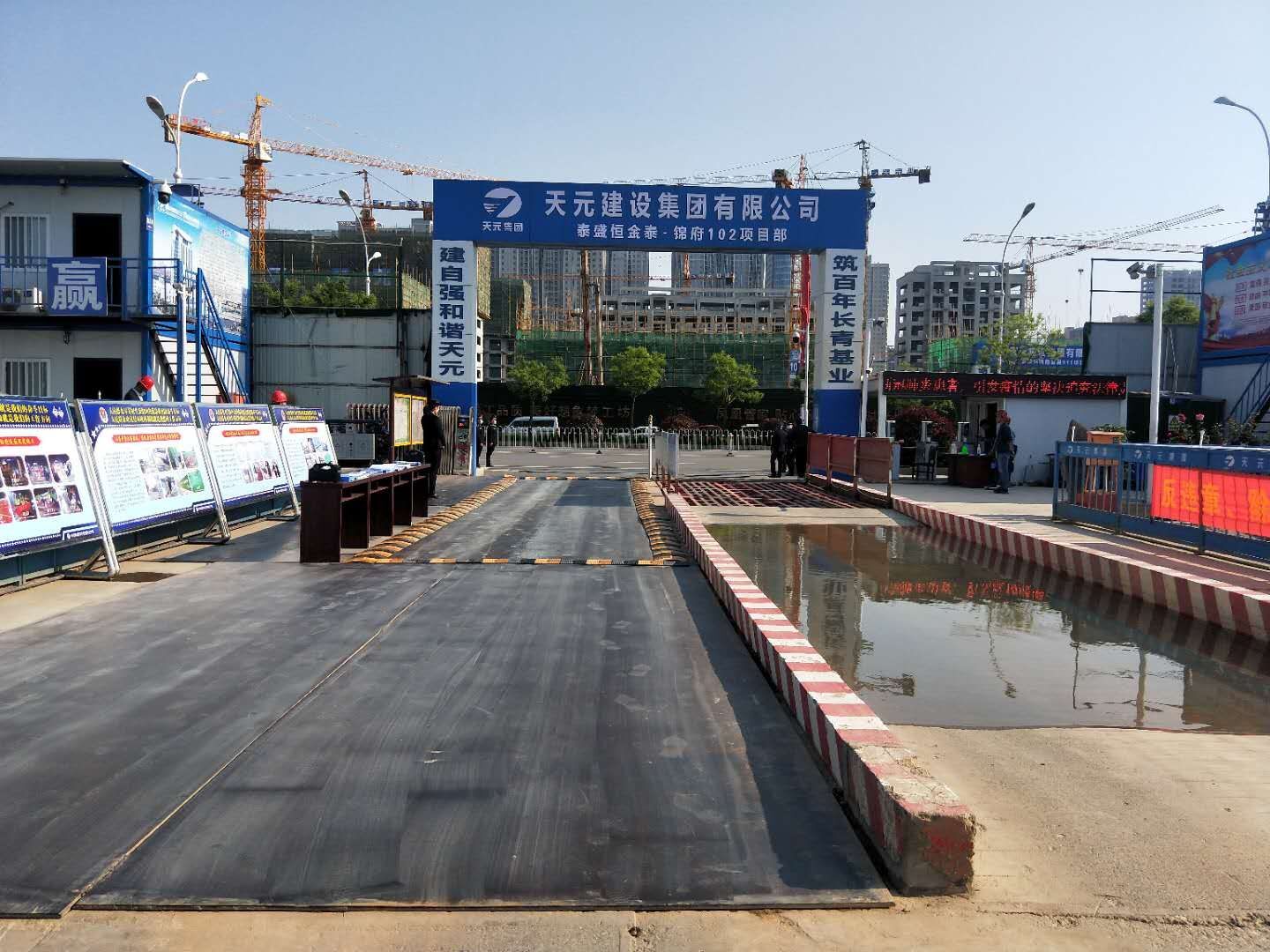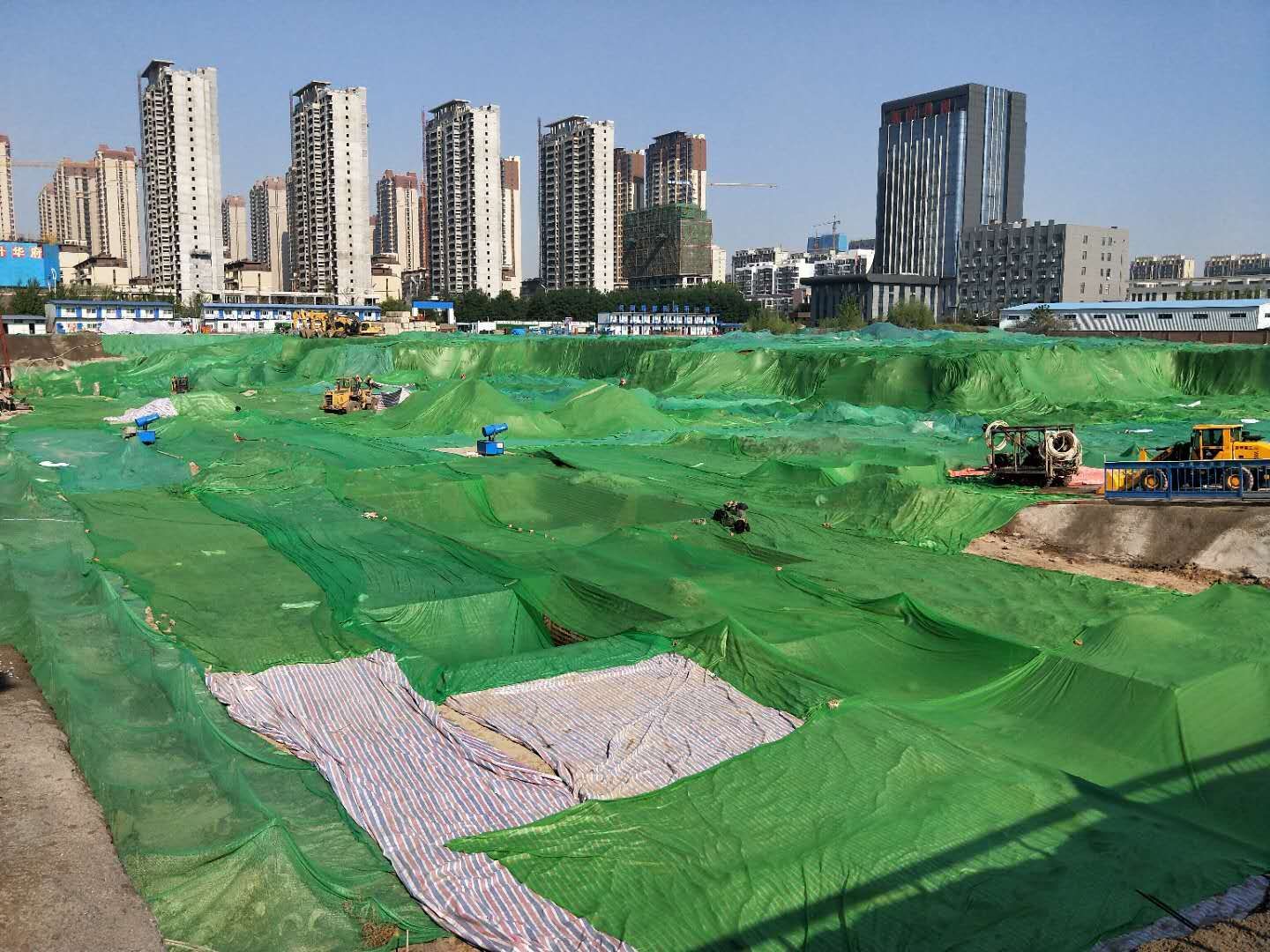 為了控制揚(yáng)塵,金泰·錦府項(xiàng)目工地配備了齊備的揚(yáng)塵防治設(shè)施:施工圍擋、清洗設(shè)施、圍擋噴淋,并安裝了聯(lián)網(wǎng)監(jiān)控、號(hào)牌識(shí)別和道閘等設(shè)施。在工地現(xiàn)場(chǎng),主干道已經(jīng)完成硬化,往來運(yùn)輸車輛均需要經(jīng)過沖洗,防止攜帶揚(yáng)塵;綠色的防塵網(wǎng)鋪陳整齊、潔凈,實(shí)現(xiàn)了對(duì)建筑材料和土方的全覆蓋;圍擋噴淋裝置每隔一段時(shí)間會(huì)自行灑水,以達(dá)降塵效果。